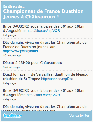 Grâce à une application affichée sur la page d’accueil du site du club (voir ci-dessous), ou directement depuis la page twitter de Poissy Triathlon (sur laquelle vous pourrez même réagir et encourager nos jeunes triathlètes – création gratuite d’un compte twitter nécessaire) vous pourrez suivre toutes les courses. Sous la forme de billets textuels, nous vous transmettrons les informations à chaud sur la participation de nos athlètes. Alors à vos écrans pour ne pas manquer cette nouvelle expérience !